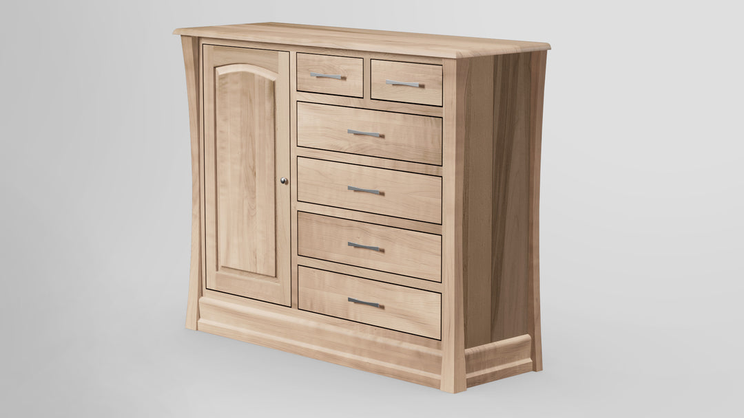 The Clover Green 6 Drawer Chest Combo is defined by a fundamental American sensibility that blends epic lines with fluid arches. The chest has substantial proportions, solid construction, grand legs and rails, and each piece of premium lumber used is hand-selected with an eye for color and grain match. Handcrafted of all solid-wood and is Made in USA.