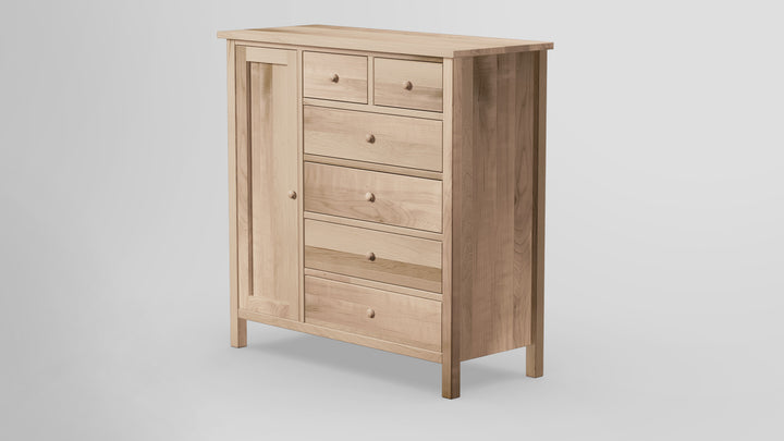 The Footprint 6 Drawer Chest Combo With Left Wardrobe is a traditional style, heirloom-quality piece that evokes an inviting simplicity, purity of form, and openness. This time-honored design is defined by clean lines and architectural detailing. Handcrafted of all solid-wood and is Made in USA.
