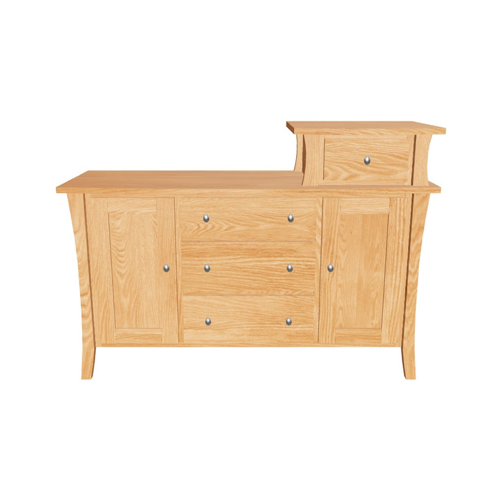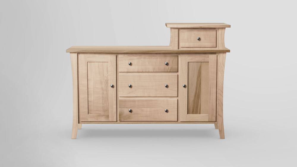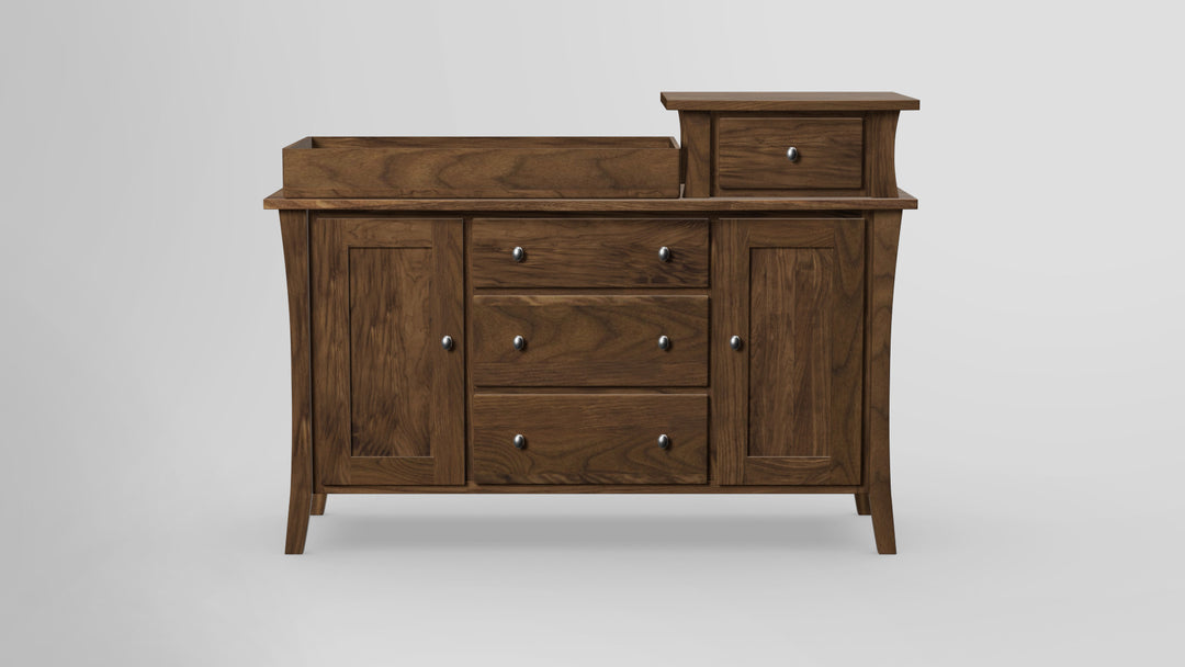 The Forest Green Changing Tower offers a unique and versatile take on an impeccable contemporary flare. From the tapered flowing legs to the assymetrical top drawer, this exquisite piece reflects the relaxed, modern take of the Forest Green Collection. The look is equal parts classic craftsmanship and fresh design. The piece is not just appealing to the eye, but rather a functional storage space with three full range, full-sized, soft close sliding drawers, and three more hidden interior pull-outs, plus the genius easy-reach top drawer, for easy organization and access that can hide clutter, clothing, diapers, socks, undergarments, creams, toys or whatever other necessities you might not want out in the open. Handcrafted of all solid-wood and is made in USA.